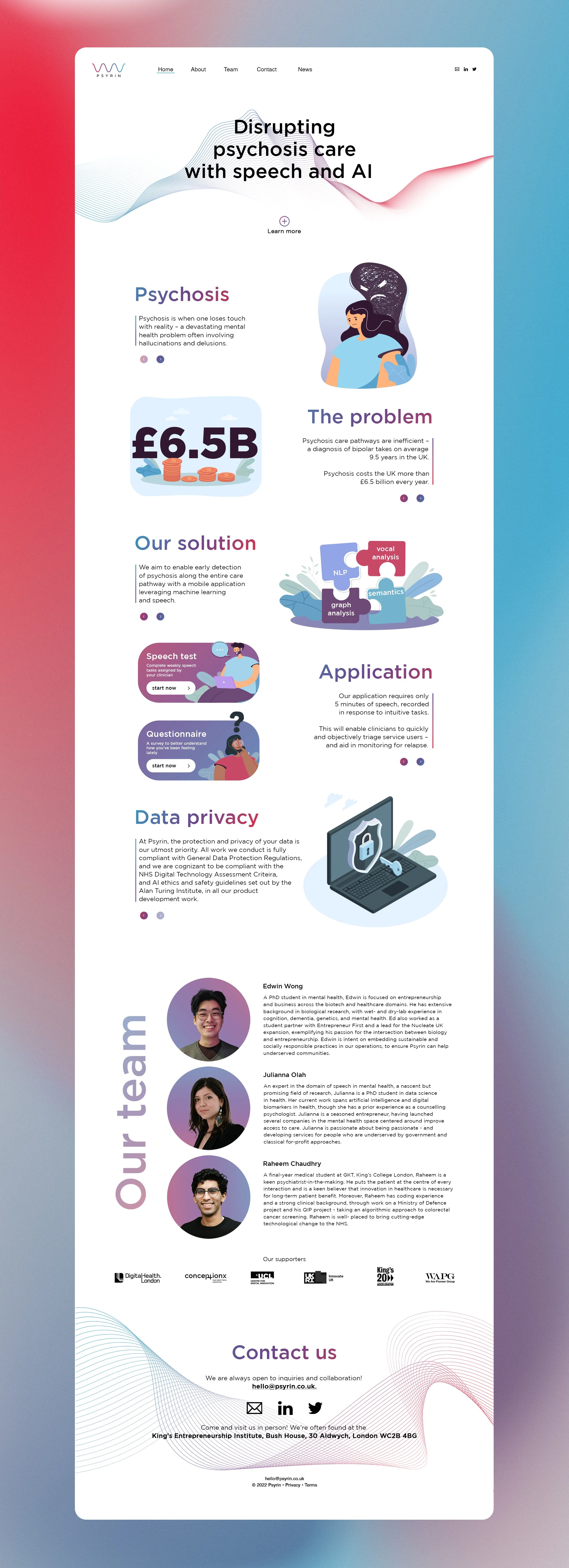 Since March of 2022, Psyrin has been developing a machine learning algorithm that will detect impending psychosis from speech samples collected using just a smartphone, prompting early intervention and significantly improving quality-of-life outcomes.